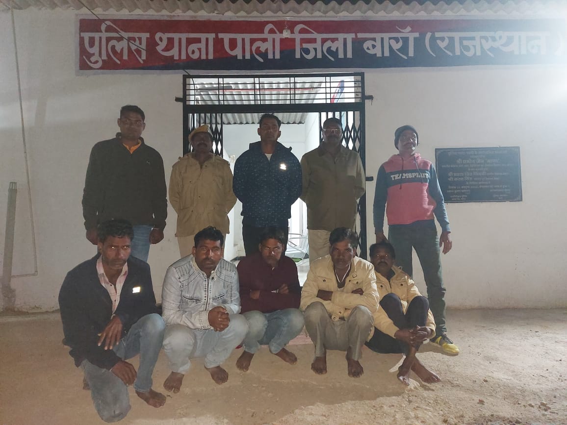 पुलिस अधीक्षक जिला बारां श्री कल्याणमल मीना आईपीएस ने बताया कि जिला बारां में अवेध कार्यों के खिलाफ चल रहे विशेष अभियान के श्री जिनेन्द्र जैन अतिरिक्त पुलिस अधीक्षक बारां के निर्देशन में श्रीमति पुजा नागर आरपीएस वृताधिकारी वृत छबड़ा के निकटतम सुपरविजन में अभियान की पालना में पाली थानाधिकारी श्री राधाकिशन उनि ने थाना पाली की पुलिस टीम गठीत कर इलाका थाना के फेजपुरा गावं पहाड़ी से मुखबीर की सूचना पर ताश के पत्तो पर जुआ खेलते पांच व्यक्तियो को गिरफ्तार कर 20800 रुपये बरामद किये । नाम पता मुलजिम:-