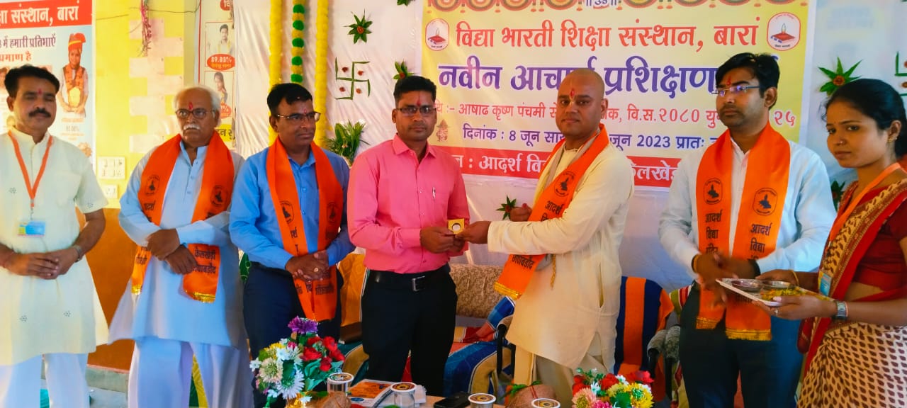 बाराँ – शहर के मांगरोल बाईपास रोड पर स्थित विद्या भारती विद्यालय स्वामी विवेकानंद विद्या निकेतन माध्यमिक विद्यालय के प्रधानाचार्य दीनदयाल नागर को उत्कृष्ट परीक्षा परिणाम देने पर विद्या भारती शिक्षा संस्थान द्वारा जिला स्तर पर सम्मानित किया गया।विवेकानन्द विद्यालय शिक्षा समिति के अध्यक्ष हितेश बत्रा सचिव मनीष अग्रवाल ने जानकारी देते हुए बताया कि विद्या भारती द्वारा छीपाबड़ौद में आयोजित जिला स्तरीय वार्षिक प्रतिभा सम्मान समारोह में स्वामी विवेकानंद विद्या निकेतन विद्यालय के प्रधानाचार्य दीनदयाल नगर इस्कॉन संस्थान के मायापुरवासी महाराज विद्या भारती के जिला मंत्री अशोक योगी जिला सचिव राजेंद्र कुमार शर्मा प्रधान हरिओम नागर सामाजिक कार्यकर्ता संग्राम सिंह मीणा ने विद्यालय का दसवीं बोर्ड परीक्षा परिणाम शतप्रतिशत रहने पर स्मृति चिन्ह अंग वस्त्र देकर सम्मानित किया।शत-प्रतिशत परिणाम रहने पर जिला एवं प्रांत के पदाधिकारियों नागर को बधाई एवं शुभकामनाएं प्रेषित की।यह जानकारी विद्या भारती के प्रचार विभाग द्वारा दी गई।
