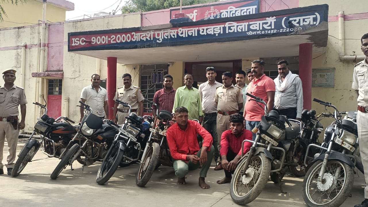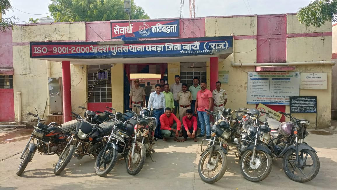 बाइक चोर गिरोह चढ़ा पुलिस के हत्थे, आरोपियों की निशानदेही पर एक दर्जन चोरी की बाइक जब्त, गिरोह के दो सदस्यों को मौके से किया गिरफ्तार, करण व विक्की कंजर नामक दो लोगों को किया गया गिरफ्तार, गिरोह के बाकी सदस्यों की जारी है तलाश, CI छुट्टनलाल मीणा के नेतृत्व में की गई कार्रवाई