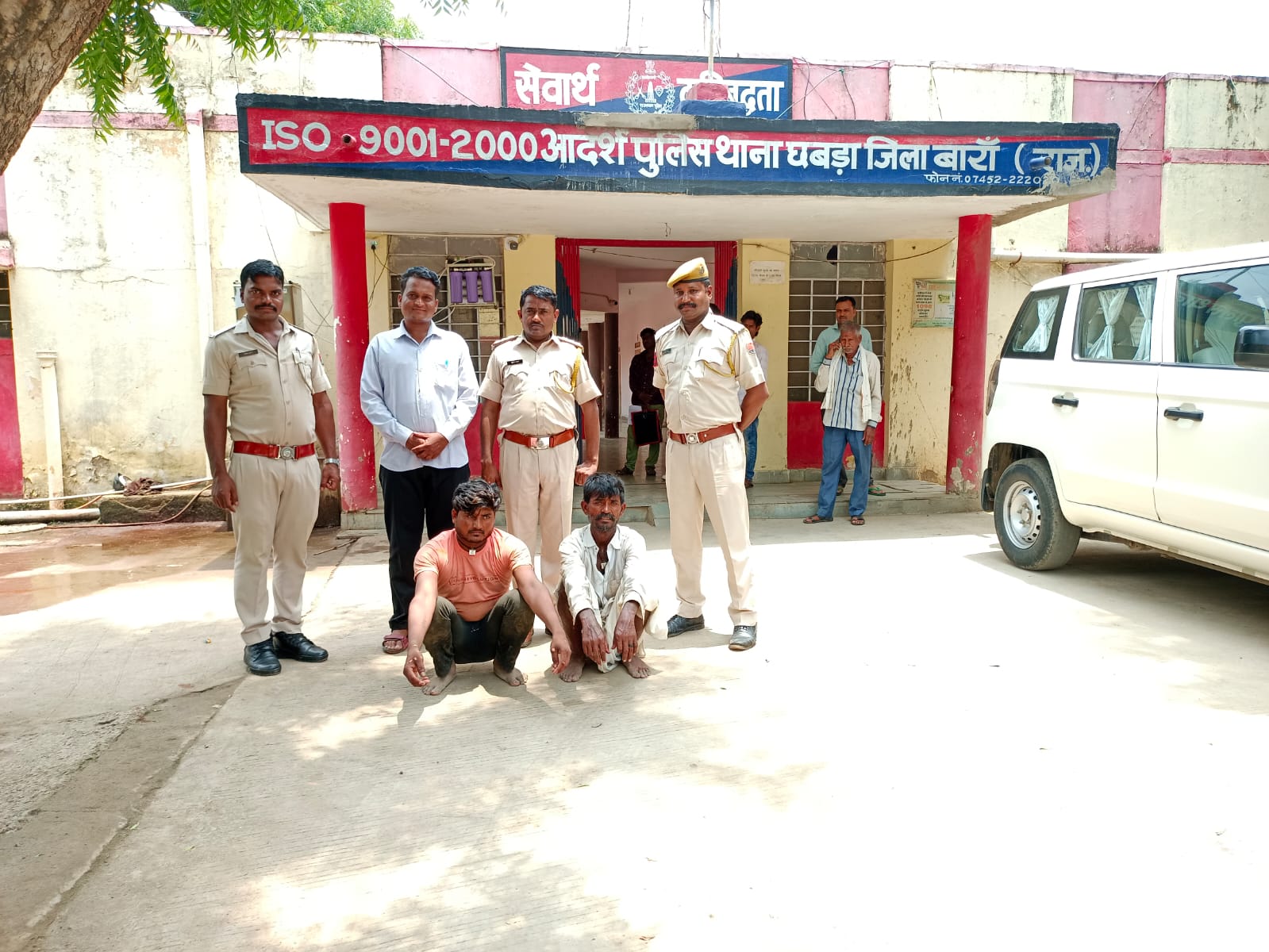 पुलिस अधीक्षक जिला बारा राज कुमार चौधरी ने बताया कि दौराने गश्त चैकिंग कर अवैध कार्य एवं अवैध मादक पदार्थ की तस्करी, जुआ सटटा, शराब की रोकथाम के विरूध्द चलाये जा रहे अभियान के तहत जिनेन्द्र कुमार जैन अतिरिक्त पुलिस अधीक्षक बारां, गिरधर सिंह वृताधिकारी वृत छबड़ा के निर्देशन मे को छुटटनलाल पु०नि० थानाधिकारी थाना छबड़ा नय थाना जाप्ता की टीम ने दौराने कस्बा गस्त मुखबिर खास से सूचना मिली की बापचा की तरफ से एक पिक अप आ रही है जिसमें ठुसठुस के भैसे भरी हुई है जिस पर रवाना होकर हनुमतखेडा फाटक के पास चांचौडा तिराहे पर नाकाबंदी की गई तो लहराती हुई तेज गति से एक पिक अप आई जिसको हाथ का ईशारा देकर रोका एवं पिक अप चालक का नाम पता पूछा तो अपना नाम बाबूलाल बागरिया निवासी नंदलालपुरा थाना कोटखावदा जिला जयपुर का होना बताया एवं पिक अप मे बैठे दुसरे व्यक्ति ने अपना नाम सोन्या बागरिया निवासी नागल करेडा थाना तडवास जिला टोंक हाल महाराना प्रताप कोलोनी वार्ड न0 20 चाकसू थाना चाकसू का होना बताया। नियमानुसार पिक अप को चैक किया तो पिक अप में 09 भैंसे ठूस-ठूस के नरी हुई थी जबकि पिक अप मे 03 भैसों के आने की जगह होती है जिनसे उक्त भैंसों के खरीद पत्र व मार्ग पत्र चाहा तो नहीं होना बताया। इस प्रकार उक्त अभियुक्तगणों के विरूध्द धारा 9बी / 11 पशु कुरता अधिनियम का अपराध होने से प्रकरण दर्ज कर भैसों को अभियुक्तगणों के कब्जे से मुक्त करवाते हुए एवं पिक अप को जब्त किया कर गिरफतार किया गया है।