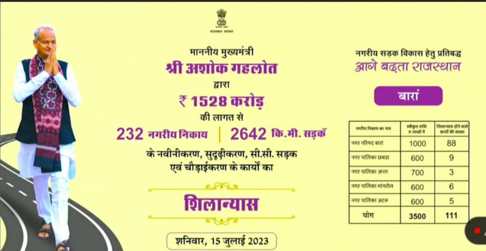 बारां जिले में शहरी क्षेत्रो में सड़को की स्थिति को बेहतर बनाने के उद्देश्य से मुख्यमंत्री अशोक गहलोत की बजट घोषणा संख्या 94/2023-24 के तहत जिले के 5 नगरीय निकायांे के सुदृढ़ीकरण, नवीनीकरण, सीसी सड़क कार्यो की प्रशासनिक एवं वित्तीय स्वीकृति 2 जून 2023 को प्राप्त हुई। इस स्वीकृति के तहत नगर परिषद बारां में 88 कार्यांे की लम्बाई 10.38 कि.मी. राशि रूपए 10 करोड़, नगर पालिका अटरू में 5 कार्यों की लम्बाई 7.45 किमी राशि रूपए 6 करोड़, नगर पालिका मांगरोल में 6 कार्यांे की लम्बाई 3.80 किमी राशि रूपए 6 करोड़, नगर पालिका अन्ता में 3 कार्यों की लम्बाई 3.34 किमी राशि रूपए 7 करोड़ एवं नगर पालिका छबड़ा में 9 कार्यों की लम्बाई 3.33 किमी राशि रूपए 6 करोड़ की निविदा स्वीकृति कर सभी कार्यांेे के कार्यादेश जारी किए जा चुके हैं। नगर परिषद बारां के कार्यांे को मई-2024 तक पूर्ण किया जाना प्रस्तावित हैं एवं नगर पालिका अटरू, मांगरोल, अन्ता एवं छबड़ा को मार्च-2024 तक पूर्ण किया जाना प्रस्तावि