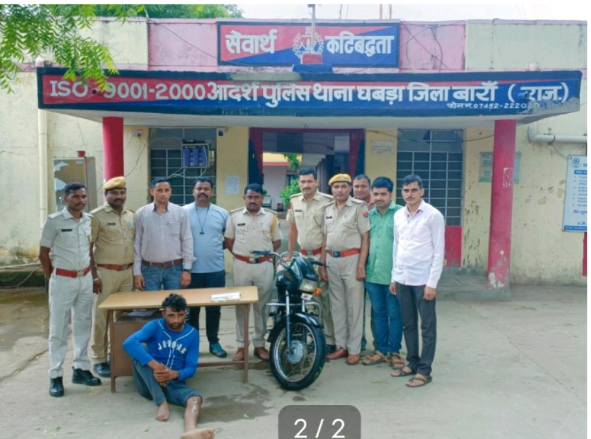 जिला पुलिस अधीक्षक बारा राज कुमार चौधरी ने बताया कि आगामी चुनाव को मध्यनजर रखते हुए अवैध हथियार, मादक पदार्थ, जुआ, सटटा के विरूद्ध कार्यवाही करने को लेकर चलाये जा रहे विशेष अभियान के तहत अतिरिक्त पुलिस अधीक्षक जिनेन्द्र जैन व गिरधर सिंह वृताधिकारी वृत छबडा के निर्देशन मे छुटटनलाल मीना पु०नि० थानाधिकारी थाना छबड़ा के मय जाप्ता के थाना से बॉर्डर नाकाबन्दी हेतु रवाना होकर गुगौर पार्वती नदी पुलिया पहुंचा जहां पर नाकाबंदी की गई तथा आने जाने वाले वाहनों एवं राहगीरों की सघनता से चैकिंग की जा रही थी दौराने नाकाबंदी हमीरपुर (म.प्र.) की तरफ से एक मोटरसाईकिल आती हुई दिखाई दी जिसके चालक को हाथ का ईशारा देकर रोकना चाहा तो मोटरसाईकिल चालक ने अपनी मोटरसाईकिल को वापस घुमाकर हमीरपुर (म.प्र.) की तरफ भगाने का प्रयास किया जिसे बमुश्किल हमराही जाप्ता की मदद से घेरा देकर मोटरसाईकिल स्पलैण्डर बरग काला व चालक को डिटेन कर नाम पूछा तो अपना नाम बृजेश उर्फ नितेश उर्फ अविनाश पुत्र राज बाबू