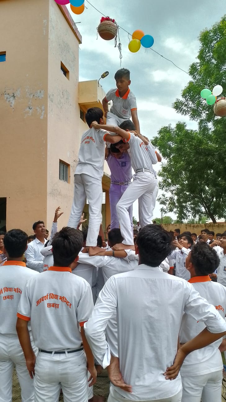 विद्यालय के उत्सव जयंती प्रभारी राजू कुशवाहा ने बताया कि कक्षा 6 से दशम तक के भैयाओं की कक्षा से दहीहांडी फोड़ने का कार्यक्रम रखा गया जिसमें कक्षा नवम कक्षा दशम के भैयाओं ने दही हांडी फोड़ कर पुरस्कार प्राप्त किया शिशु वाटिका प्रभारी श्वेता शर्मा ने जानकारी देते हो बताया कि शिशु वाटिका के 101 भैया बहिन राधा और कृष्ण बनकर आए और सजीव झांकियां बनाकर उत्साह पूर्वक श्री कृष्ण जन्माष्टमी मनाई गई।