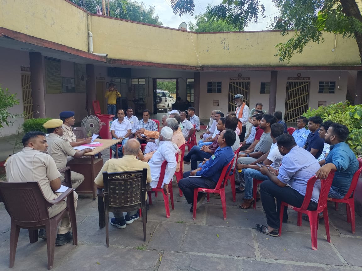 स्थानीय पुलिस प्रशासन की और से थाना परिसर में रविवार को सीएलजी व शांति समिति की बैठक आयोजित की गई जिसकी पुलिस उप अधीक्षक नेत्रपाल सिंह ने अध्यक्षता की।सीआई छुट्टन लाल मीणा के अनुसार बैठक में आगामी त्यौहारों को लेकर चर्चा की गई एवं समस्त त्योहार सौहार्द पूर्ण वातावरण में पूरी शांति के साथ मनाने का आह्वान किया गया। बैठक में मुख्य रूप से तेजादशमी, जलझूलनी एकादशी, अनंत चतुर्दशी व ईद मिलादुन्नबी पर्व को लेकर चर्चा की गई। बैठक में अंनत चतुर्दशी की शोभायात्रा व ईद मिलादुन्नबी के जुलूस को लेकर चर्चा की गई। बैठक में शोभायात्रा व जुलूस संचालन समिति के लोगो ने उप अधीक्षक नेत्रपाल सिंह को जुलूस व शोभायात्रा के रुट आदि के बारे में जानकारी दी। वहीं सभी ने त्यौहारों को शांति, सद्भाव, हर्षोल्लास से मनाने की बात कही। सदस्यों ने जुलूस व शोभायात्रा को लेकर क़स्बे में सड़कों पर हो रहे गड्डो को भरवाने, सीसीटीवी कैमरे चालू करवाने व प्रतिमा विसर्जन के लिए क्रेन की व्यवस्था, एसडीआरएफ, एनडीआरएफ सहित स्थानीय गोताखोरों को तैनात करने की मांग की। बैठक में सीआई छुट्टनलाल मीणा सहित नगर पालिका जेईएन नारायण लाल मीणा, भाजपा नेता हिम्मत सिंह सिंघवी, पालिका उपाध्यक्ष अबरार अहमद सिद्दीकी, कांग्रेस नेता रेवती गेरा, गोविंद सोनी दरबार, पार्षद नवीन उपाध्याय, खालिद राणा, रितेश उपाध्याय, गोविंद कोली, राजेश भार्गव, बसपा नेता रईस प्रगति, डालचंद कुशवाह, पार्षद सुनील तेजस्वी, अब्दुल अज़ीज गौरी, इरशाद, प्रकाशवीर आर्य, एडवोकेट दीपक वर्मा, किशन भार्गव, महेंद्र भार्गव सहित अन्य लोग मौजूद रहे।