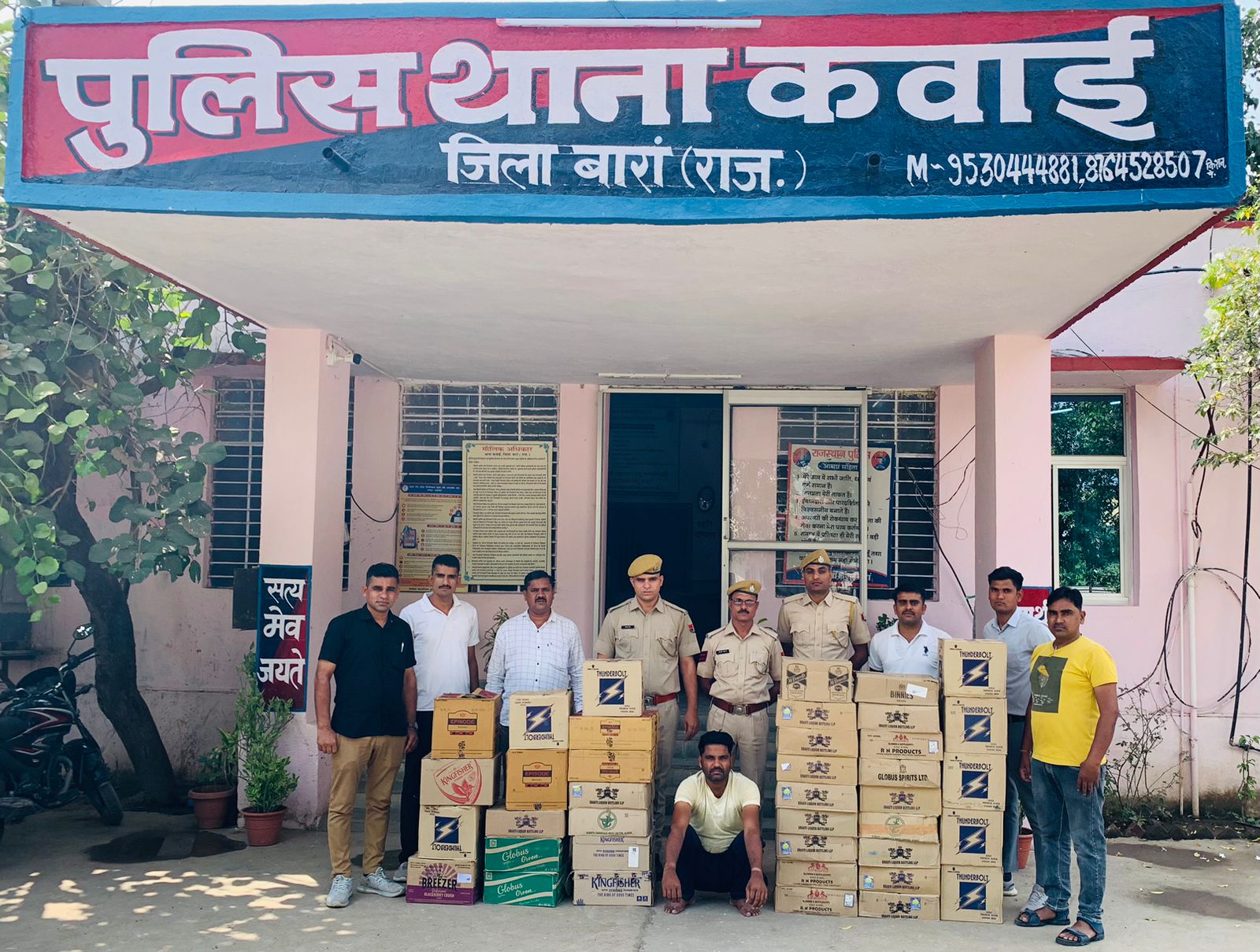 श्रीमान पुलिस अधीक्षक श्री राजकुमार चौधरी ने बताया कि विधानसभा चुनाव 2023 की आदर्श आचार संहिता की पालना करवाने हेतु ज़िले में अनेक टीमो का गठन कर श्री घनश्याम शर्मा अतिरिक्त पुलिस अधीक्षक बारा के निकटतम सुपरविजन में समस्त वृताधिकारियो और थानाधिकारियों को निर्देशित किया गया था। दिनांक 17.10.2023 को थानाधिकारी थाना कवाई श्री रामस्वरूप मीना के निर्देशन में डीएसटी टीम की सहायता से श्री किशन सिंह सउनि , श्री महेंद्र कानि 1413 श्री दिनेश कानि 1030 , श्री पर्वत कानि 816 ने मय जीप सरकारी चालक श्री अशोक कानि 1036 द्वारा ग्राम मूसेनगुजरान थाना कवाई में प्रभावी कार्यवाही करते हुये राजेंद्र मेहता के मकान से रात्रि में दबिश कर बड़ी मात्रा में अंग्रेज़ी और देशी शराब के अलग अलग ब्रांड की 41 पैटी शराब पकड़ी।पकड़ी गई शराब में 22 पैटी देशी शराब,13 पैटी बीयर और 6 पैटी अंग्रेज़ी शराब के क्वार्टर, हाफ़ और बोतल थी। मुलज़िम राजेंद्र मेहता से शराब जप्त कर प्रकरण संख्या 202/2023 धारा 19/54, 20/54 आबकारी अधिनियम में दर्ज कर तफ़तीश जारी है। मुलज़िम राजेंद्र मेहता से अवैध शराब जप्ती के संबंध में गहन अनुसंधान जारी है।