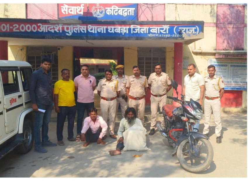 जिला पुलिस अधीक्षक जिला बारा राज कुमार चौधरी ने बताया कि आगामी विधान सभा चुनाव 2023 को मध्यनजर रखते हुये अवैध कार्यों मादक पदार्थ की तस्करी, जुआ, सटटा, शराब, हथियारों की रोकथाम हेतु चलाये जा रहे अभियान के तहत घनश्याम शर्मा अतिरिक्त पुलिस अधीक्षक बारां व तरूण कान्त सोमानी वृताधिकारी वृत छबड़ा के निर्देशन में थानाधिकारी छुट्टनलाल मीना पु०नि०. मय थाना जाप्ता व एफ०एस०टी० टीम द्वारा कोलूखेडी तिराहा कुमराज रोड पर नाकाबन्दी की जा रही थी कि उसी दौरान नदी दरवाजा के तरफ से 01 मोटरसाईकिल पर 02 व्यक्ति आते हुए दिखाई दिये जिनके पास मोटरसाईकिल पर बीच मे एक सफेद रंग का प्लास्टिक का कट्टा रखा हुआ था जो पुलिस जीप को देखकर एकदम से रोड से नीचे उतर कर झाड़ियो की तरफ जाने लगे, जिनके पास मे कोई संदिग्ध वस्तु होने का शक होने से मोटरसाईकिल पर सवार व्यक्तियों को डिटेन कर दोनो व्यक्तियो से नाम पता पूछा तो मोटरसाईकिल चालक ने अपना नाम छीतरलाल माली निवासी गोविन्दपुरा थाना छीपाबडोद जिला बारां (राज0) का होना बताया व मोटरसाईकिल पर पीछे बैठे व्यक्ति ने अपना नाम राजाराम भील निवासी कचनारिया खुर्द थाना हरनावदाशाहजी जिला बारां (राज0) का होना बताया दोनो व्यक्तियों के पास मोटरसाईकिल के बीच मे रखे सफेद प्लास्टिक के कट्टे को खोलकर देखा तो कट्टे के अन्दर 07.743 किलोग्राम अवैध मादक गांजा होना पाया गया। इस पर अभियुक्तगण 1 छीतरलाल माली व 2. राजाराम भील को मौके पर ही हिरासत पुलिस लिया गया एवं उनके कब्जे से मिले अवैध मादक पदार्थ 7.743 किलोग्राम गांजे को जब्त कर उक्त जप्तशुदा गांजे की बाजार में कीमत आंकी गई तो 04 लाख रूपये के लगभग होना मालूमात हुआ है उक्त दोनों अभियुक्तों के विरूध्द धारा 8/20,29 एन.डी.पी.एस. एक्ट के तहत प्रकरण दर्ज कर गिरफ्तार किया गया है। मुल्जिमान उक्त अवैध मादक पदार्थ कहां से लेकर आये व कहां देने जा रहे थे इस संबंध में अनुसंधान जारी है ।