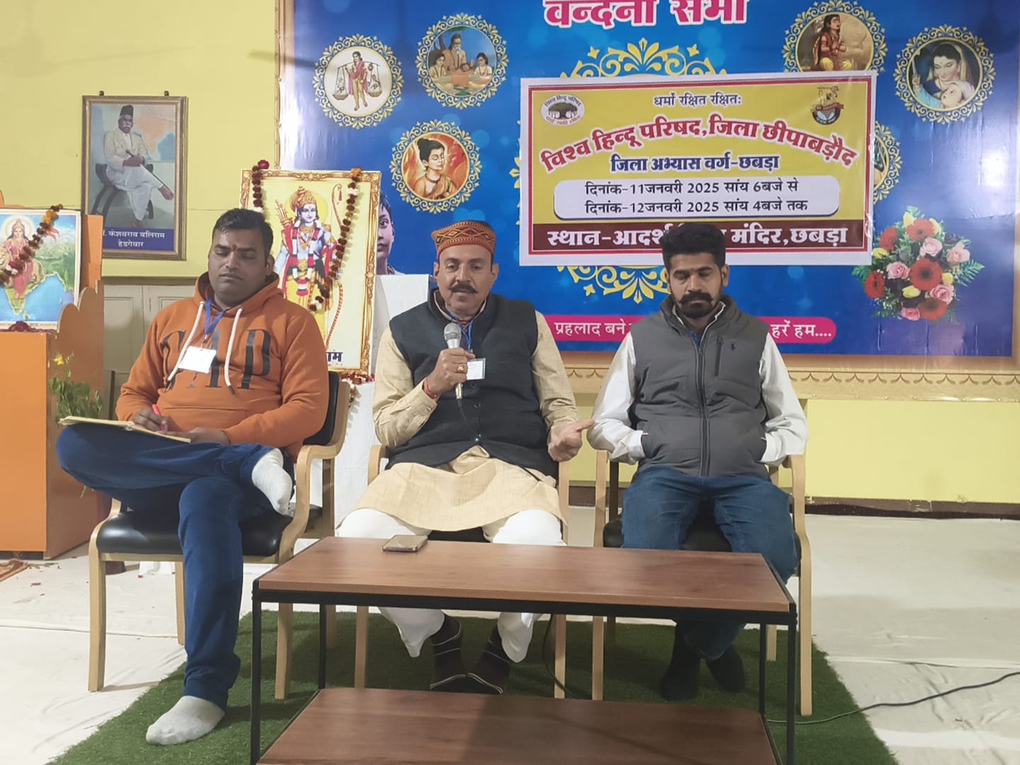 विहिप जिला प्रचार प्रमुख कैलाश सुमन ने बताया की जिला अभ्यास वर्ग मैं भाई साहब युधिष्ठिर सिंह जी हाडा विश्व हिंदू परिषद चित्तौड़ प्रांत सह मंत्री जी का प्रवास रहा अभ्यास वर्ग 2 दिवस में 5 सत्रों में सम्पन्न हुआ अभ्यास वर्ग के पहले सत्र में युधिष्ठिर सिंह हाडा जी ने विभाग संयोजक हिमांशु जी शर्मा, जिला मंत्री धनराज जी सुमन जिला उपाध्यक्ष दीपक जी गोयल ओर नंदलाल जी के साथ दीप प्रज्वलित कर कार्यक्रम की शुरुआत की उसके बाद भाईसाहब युधिष्ठिर सिंह जी हाडा ने हिंदू परिषद की स्थापना ओर संगठन की रीति नीतियों को विस्तार से बताया अगले दिन दूसरे सत्र में संगठन आचार पद्धति, 3ओर 4 वे सत्र में संगठन के विभिन्न आयामों के बारे में ओर आयामों के कार्यों के बारे में विस्तार से बताया अंत में 5वे समापन सत्र में अपने उद्बोधन में सनातन धर्म के बारे में विस्तार से बताया इसके बाद जिला मंत्री धनराज जी सुमन ने प्रखंड ओर नगर, ओर खंड के विभिन्न दायित्व की घोषणा की आभास वर्ग में मातृ शक्ति सहित जिला सह मंत्री भरत जी गालव, पूरी लाल जी सोनी, जिला संपर्क प्रमुख रामनिवास जी नागर नन्द जी सुमन बजरंग बल जिला संयोजक, नवीन जी नागर बजरंग दल जिला सह सयोजक सहित 5 प्रखंड खंड ओर नगर के दायित्वान पदाधिकारी उपस्थित रहे अभास वर्ग में 45 दायित्वान कार्यकर्ता मौजूद रहे