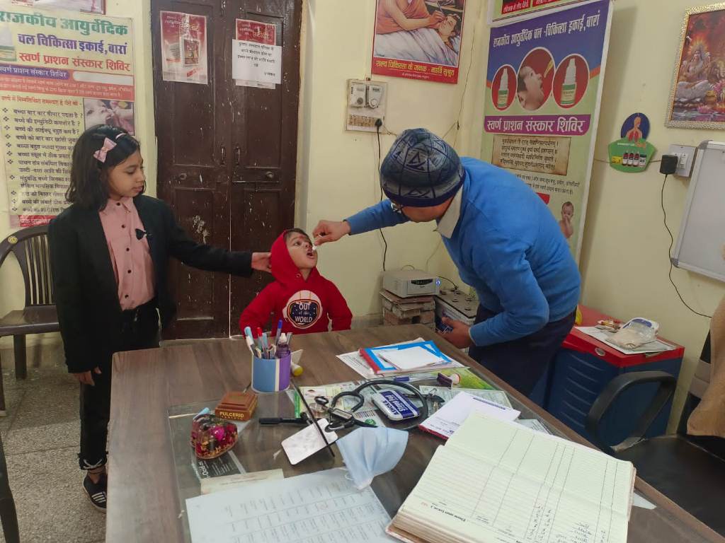 बारां 14 जनवरी। शहर में सत्संग 16 वर्ष के बच्चों को स्वर्ण प्राशन ड्रॉप पिलाई गई।भवन मार्ग स्थित राजकीय आयुर्वेदिक चल चिकित्सा इकाई में 0 से 16 वर्ष के बच्चों को स्वर्ण प्राशन ड्रॉप पिलाई गई। चिकित्सालय प्रभारी डॉ. हरिशंकर मीणा ने बताया कि स्वर्ण प्राशन ड्रॉप से बच्चों के शारीरिक विकास एवं मानसिक विकास में वृद्धि होती है । यह रोग प्रतिरोधक क्षमता को भी बढाती है। शिविर में 40 रोगियों को चिकित्सा परामर्श दिया गया। जिसमें खांसी, जुकाम, बुखार, चर्म रोग, अर्श, मस्सा और भगंदर के रोगियों ने चिकित्सा परामर्श लिया। रोगियों को निशुल्क औषधी दी गई। खांसी, जुकाम व बुखार के रोगियों को निशुल्क औषधि किट और काढा वितरित किया गया। शिविर में 0 से 16 वर्ष के बच्चे के 190 बच्चों ने स्वर्ण प्राशन ड्रॉप का सेवन किया। इसमें श्याम सिंह व साक्षी गोयल आदि ने सहयोग किया।r