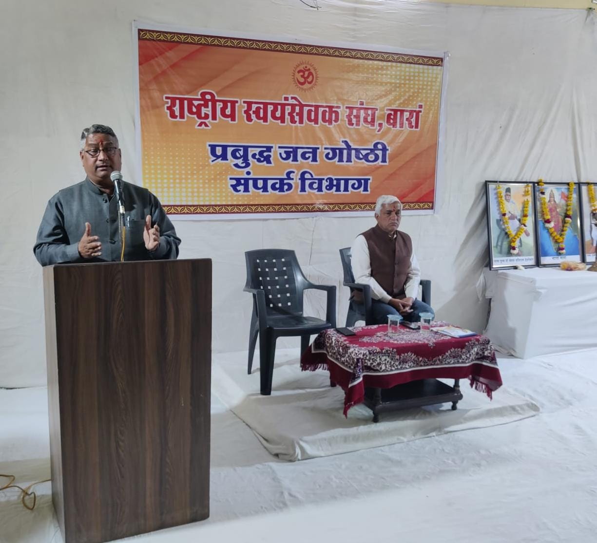 बारां – भारत प्राचीनकाल में सोने की चिड़िया और विश्व गुरु के रूप में जाना जाता था। हिंदू चिंतन का मूल सर्वे भवंतु सुखिनः प्राणी मात्र के सुख और विश्व बंधुत्व की कल्पना है, जिसमें कर्णवन्तो विश्वमार्यम का भाव निहित है। समय-समय पर अनेक महापुरुषों ने समाज का जागरण किया। इसी क्रम में पूजनीय डॉ. केशव बलिराम हेडगेवार ने 1925 में राष्ट्रीय स्वयंसेवक संघ की स्थापना की। उन्होंने संघ के माध्यम से एक ऐसे समाज का निर्माण करने का संकल्प लिया जो देश और समाज के लिए जी सके। राष्ट्रीय स्वयंसेवक संघ का लक्ष्य भारत को वैभव संपन्न बनाना है मैदान में लगने वाली संघ की शाखा में चरित्रवान संस्कारवान और देशभक्त नागरिकों का निर्माण होता है। संघ सभी मत पंथ या संप्रदाय के लोगों के लिए खुला है बशर्ते वे भारत माता को मातृभूमि मानें और उसके प्रति सम्मान रखें। यह उद्गार खंडेलवाल धर्मशाला सभागार में सोमवार रात्रि को राष्ट्रीय स्वयंसेवक संघ के संपर्क विभाग द्वारा सनातन के समक्ष चुनौतियां एवं हमारी भूमिका विषय पर आयोजित प्रबुद्ध जन गोष्ठी में राष्ट्रीय स्वयंसेवक संघ के सह संपर्क प्रमुख योगेंद्र ने व्यक्त किये। नगर संपर्क प्रमुख दीपक मीणा ने जानकारी देते हुए बताया कि कार्यक्रम का शुभारंभ भारत माता के चित्र के समक्ष दीप प्रज्वलन के साथ हुआ। मंचासीन अतिथियों का परिचय विभाग संपर्क प्रमुख सुनील गुप्ता ने कराया। कार्यक्रम का समापन एक चर्चा सत्र के साथ हुआ जिसमें प्रबुद्धजनों से सुझाव प्राप्त किए गए। राधेश्याम गर्ग जिला संघ चालक ने आभार प्रकट किया।