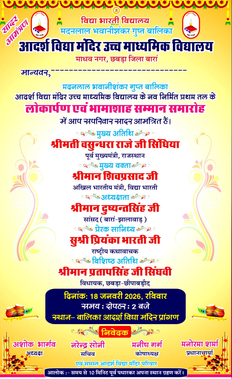 छबड़ा — विद्या भारती द्वारा संचालित मदनलाल भवानीशंकर गुप्त बालिका आदर्श विद्या मंदिर उच्च माध्यमिक विद्यालय में नव निर्मित प्रथम तल के लोकार्पण एवं भामाशाह सम्मान समारोह का आयोजन रविवार, 18 जनवरी 2026 को किया जाएगा।विद्यालय प्रबंध समिति के अध्यक्ष श्री अशोक कुमार भार्गव एवं सचिव श्री नरेंद्र सोनी ने जानकारी देते हुए बताया कि इस गरिमामय समारोह में राष्ट्रीय कथा वाचक सुश्री प्रियंका भारती का प्रेरक सानिध्य प्राप्त होगा। कार्यक्रम की मुख्य अतिथि राजस्थान की पूर्व मुख्यमंत्री श्रीमती वसुंधरा राजे सिंधिया होंगी।