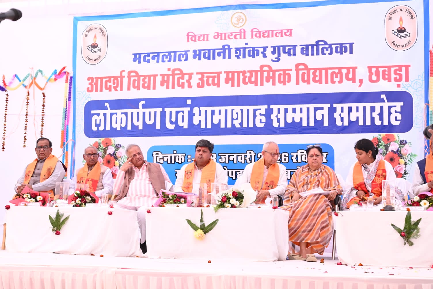 छबड़ा — विद्या भारती द्वारा संचालित मदनलाल भवानीशंकर गुप्त बालिका आदर्श विद्या मंदिर उच्च माध्यमिक विद्यालय में नवनिर्मित प्रथम तल का लोकार्पण एवं भामाशाह सम्मान समारोह अत्यंत उत्साह एवं गरिमामय वातावरण में संपन्न हुआ।